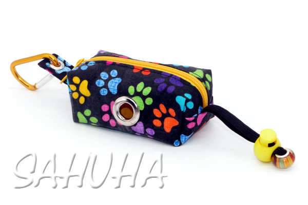 Das gefütterte Täschchen hat einen Reißverschluss zum Nachfüllen neuer Beutelrollen und eine Öse, zur Entnahme einzelner Beutel. An der Unterseite ist ein Gummiband befestigt, an welchem sich mithilfe eines Stoppers die benutzten Beutel einklemmen lassen. Damit der Stopper nicht vom Gummi abgezogen werden kann ist er durch eine große Perle gesichert. So hat man die Hände frei und kann den benutzen Beutel prima bis zum nächsten Mülleimer transportieren.